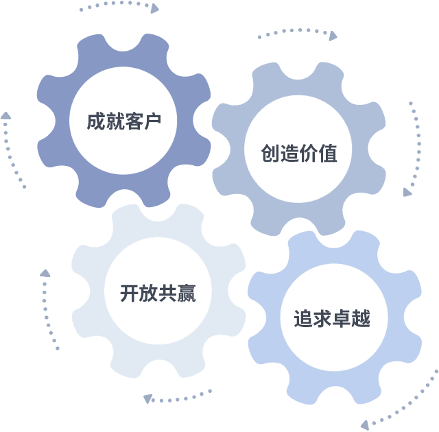 成就客户是一切决策的出发点,,,,创造价值是衡量所有工作的标准,,,,追求卓越是我们做事做人的态度,,,开放共赢是我们的格局也是最终的结果。。。价值观的齿轮环环相扣,,,推动着组织里的每个人不断向前。。