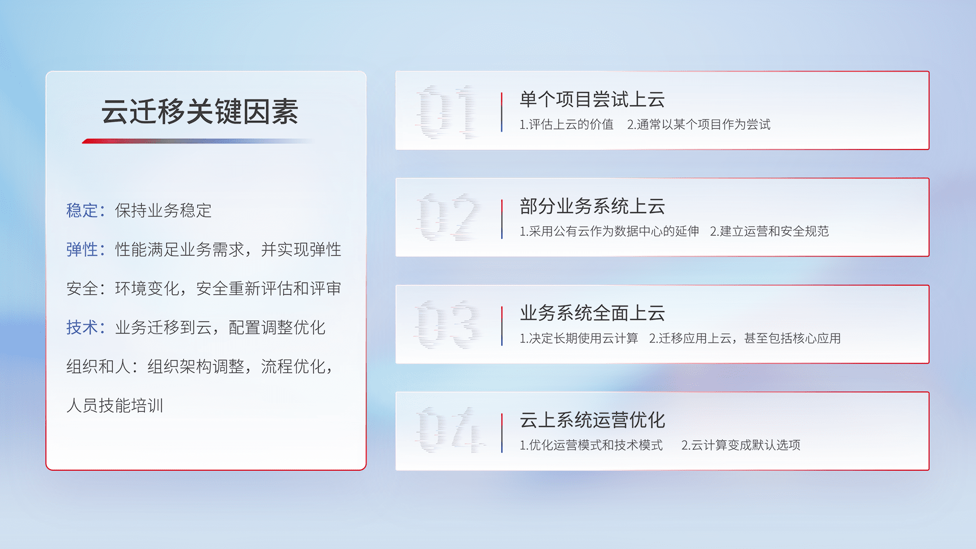 结合实际业务,,,从规划设计、、、云平台选型、、云原生改造、、、数据迁移、、、、集成交付,,,,迁移全过程为客户识别最佳上云路径,,,做好风险识别管理,,设计网络架构、、、身份权限、、、、安全审计合规、、、操作审计、、、、日志审计、、、、监控告警策略、、、、多站点容灾设计等,,对云上基础设施进行整体规划,,,提升IT治理水平,,,,以满足弹性、、、高可用、、、、高性能的需求。。。