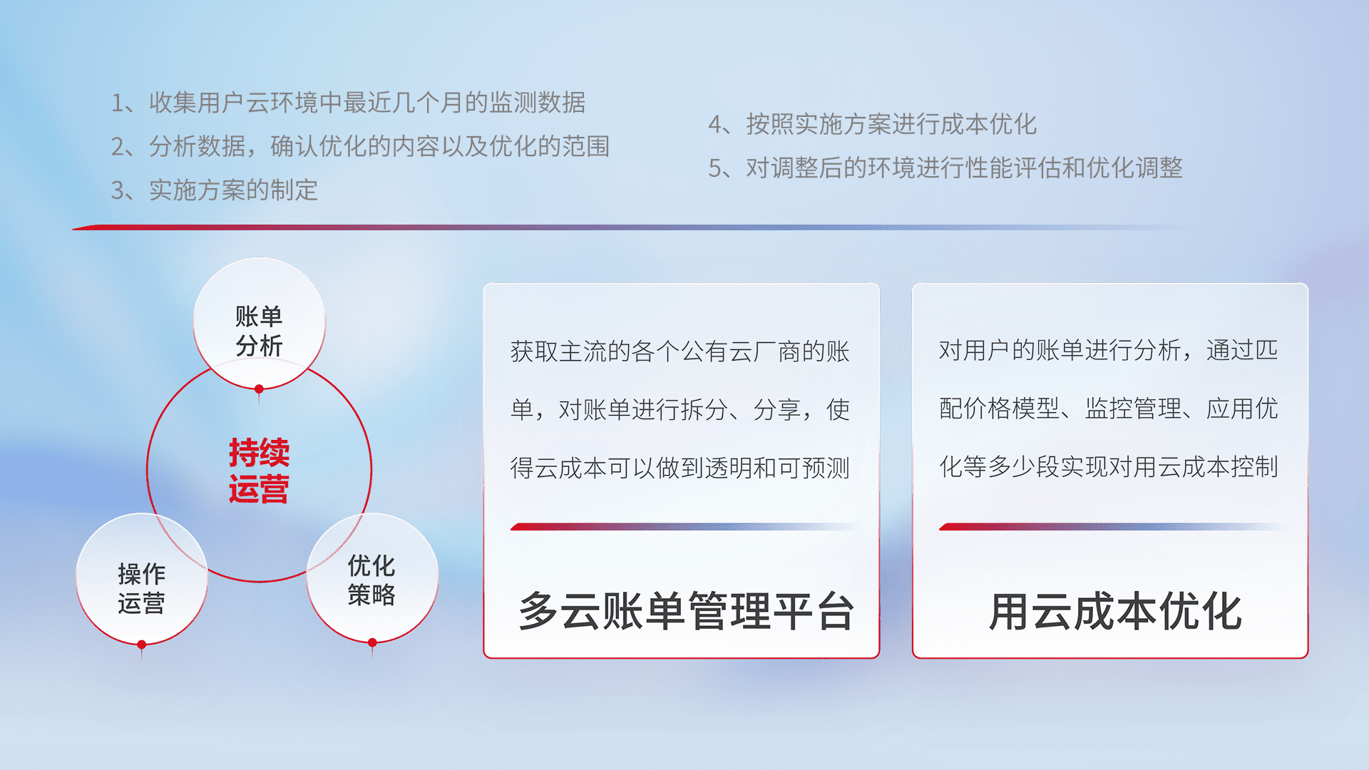 通过多云纳管,,以统一的资源数据模型把客户的云资源进行抽象和封装,,,进而实现对多云资源的统一操作,,,保障云资源管理的可靠性、、、、稳定性与可用性。。量身定制化运维内容,,配置、、、、开发运维、、、、补丁管理、、、、备份、、、、监控、、、认证和访问管理、、审计和日常巡检等,,保障在用云过程中的可靠度,,,稳定度以及高可用率。。。